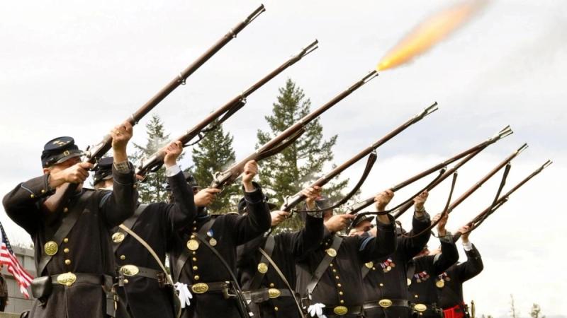In a traditional Civil War ceremony, the 4th U.S. Infantry Regiment dressed in Union uniforms, while firing musket volleys, and singing "The Battle Hymn of the Republic."