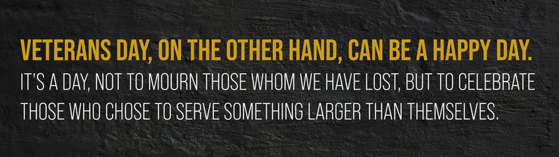 We as a country should continue every day to support our veterans through healthcare, mental health, housing, and education benefits that they have earned. Veterans Day, then, is a day that should stand to remind everyone that people in their very own communities chose to serve. They should be honored and celebrated and for that day it's ok to strut a little bit. It’s ok to be proud. It’s ok to tell stories and come together and share a toast with our friends. Vets don’t ask to be held above everyone else or given special treatment for serving. They just don’t want to be taken for granted or for everything that they sacrificed to be forgotten. The greatest tragedy for a Soldier, Sailor, Airman, or Marine is for their struggles to have been in vain. For their stories to fade away and all the sweat, pain, fear, hope, and hard work to be reduced to a dusty photo on the wall that people eventually stop looking at. Then all of those lessons learned in war are forgotten and the wounds of war are hidden, doomed to be repeated.